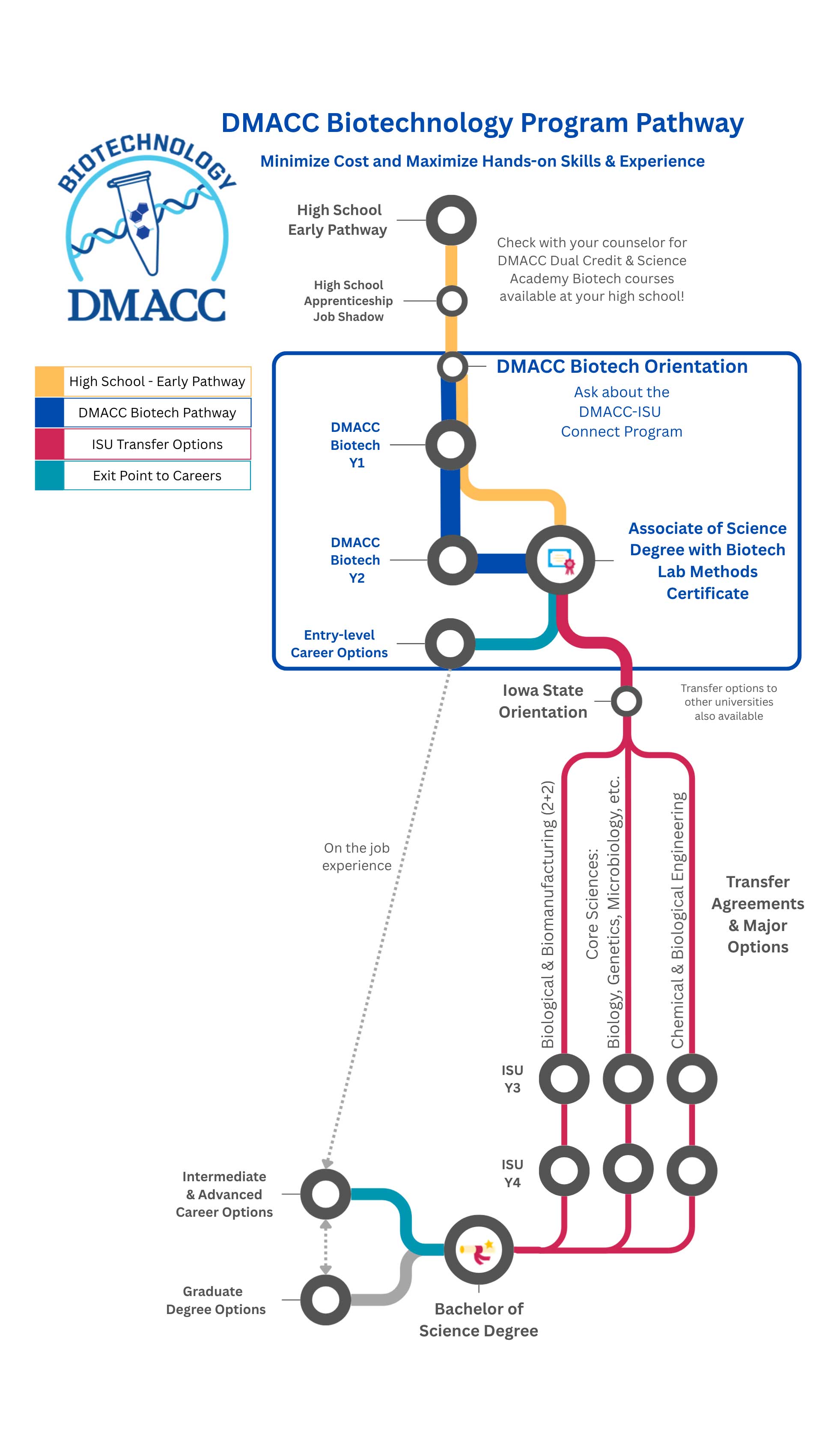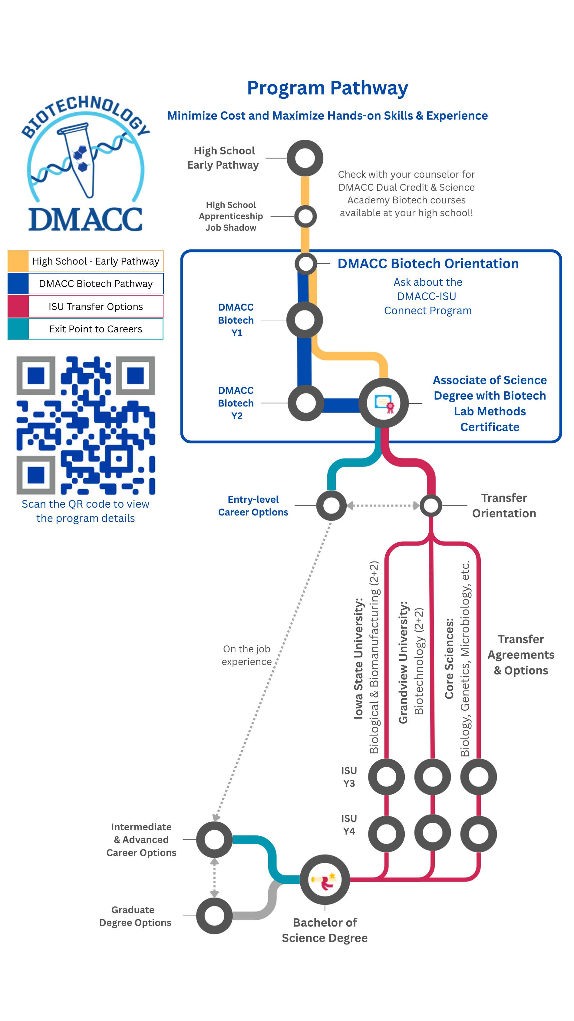 The DMACC Biotechnology program is a recipient of a National Science Foundation Advanced Technical Education award, NSF-DUE #2300876, centered on expanding the biotechnology workforce in Iowa and providing high-quality affordable educational opportunities for the future workforce. The project goal is to increase the overall number of students entering the biotechnology workforce pathway and to ensure that biotechnology educational experiences align with industry needs. Approximately 75 high school students are expected to participate in the Science Academy throughout the duration of this three-year project, and an anticipated 48 teachers will receive instruction, networking with industry partners, and biotechnology activity materials during the Summer Workshop, to replicate these experiences for students at their schools. As a result of outreach and education provided through these grant activities, 85 students are expected to complete DMACC’s AS/Biotechnology Laboratory Methods Certificate combination degree. In order to ensure that the Biotechnology program remains astride with evolving industry, project faculty will receive training in cutting edge techniques and equipment, as directed by the advisory Business and Industry Leadership Team. This project is funded by the Advanced Technological Education program that focuses on the education of technicians for the advanced technology fields that drive the nation's economy.